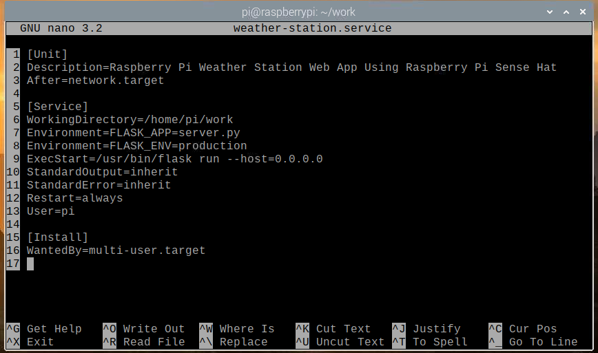 Then, press <Ctrl> + X followed by Y and <Enter> to save the weather-station.service file.