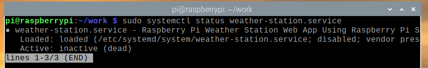 The weather-station systemd service should be inactive at the moment, as shown in the screenshot below.