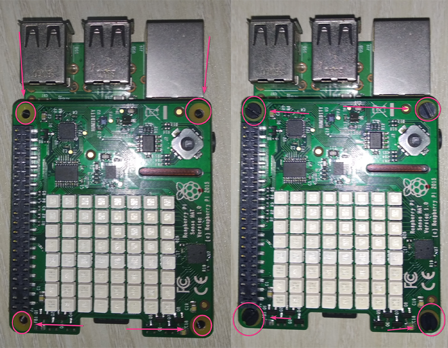 With the four remaining screws, fasten the Raspberry Pi Sense Hat, as shown in the images below.
