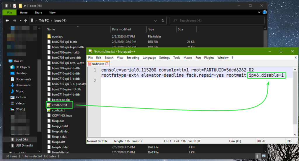 Now, open the cmdline.txt file and add ipv6.disable=1 at the end of the line to disable IPv6.