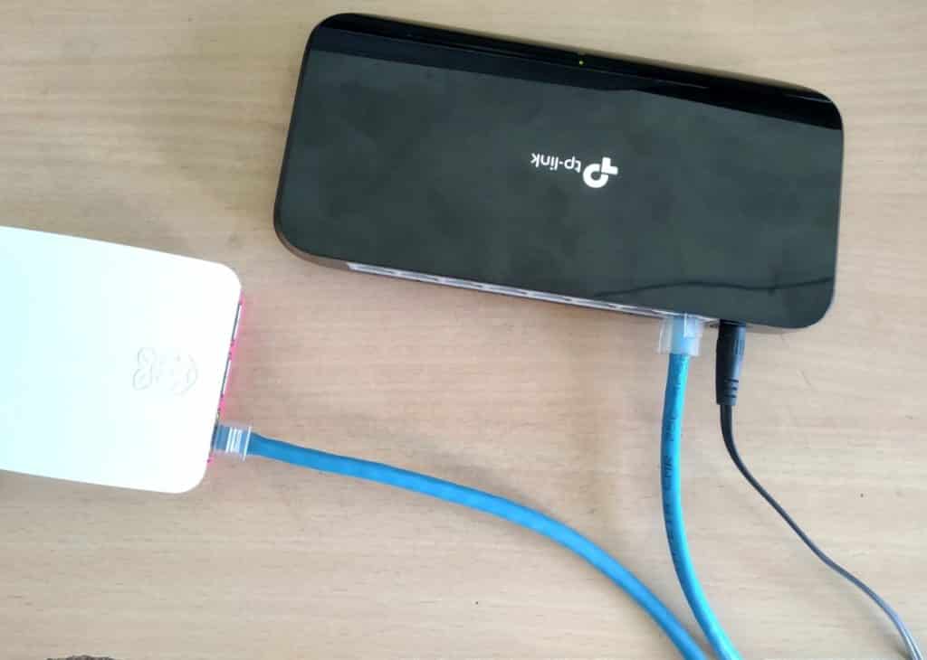 Once your Raspberry Pi starts, connect one end of another ethernet cable into the switch and the other end to your Laptop/Desktop or other devices.
