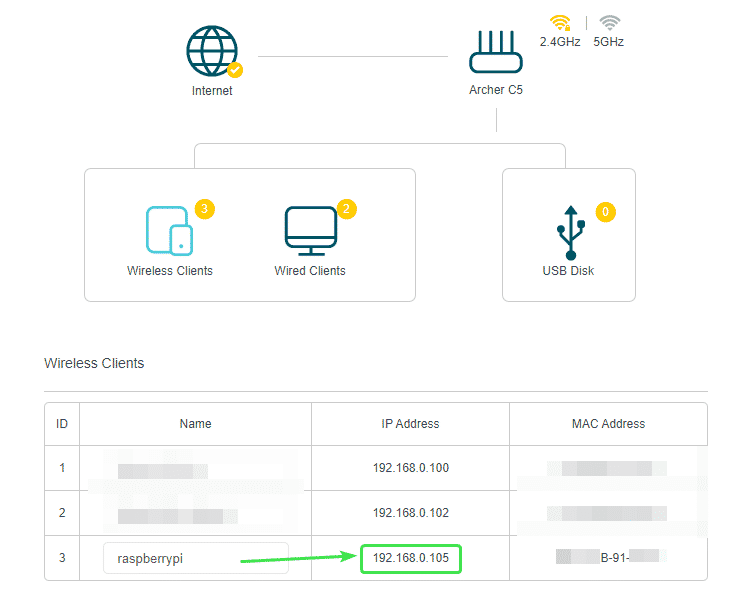 Once Raspberry Pi starts, it should get an IP address from the Wi-Fi network. You can use any network scanner or your Wi-Fi routers administration page to find out the IP address of your Raspberry Pi.