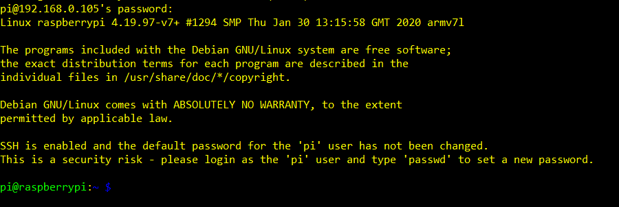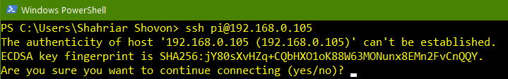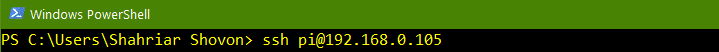 Once you find the IP address of your Raspberry Pi, connect to it via SSH as follows: