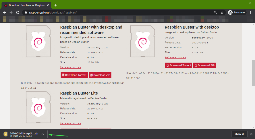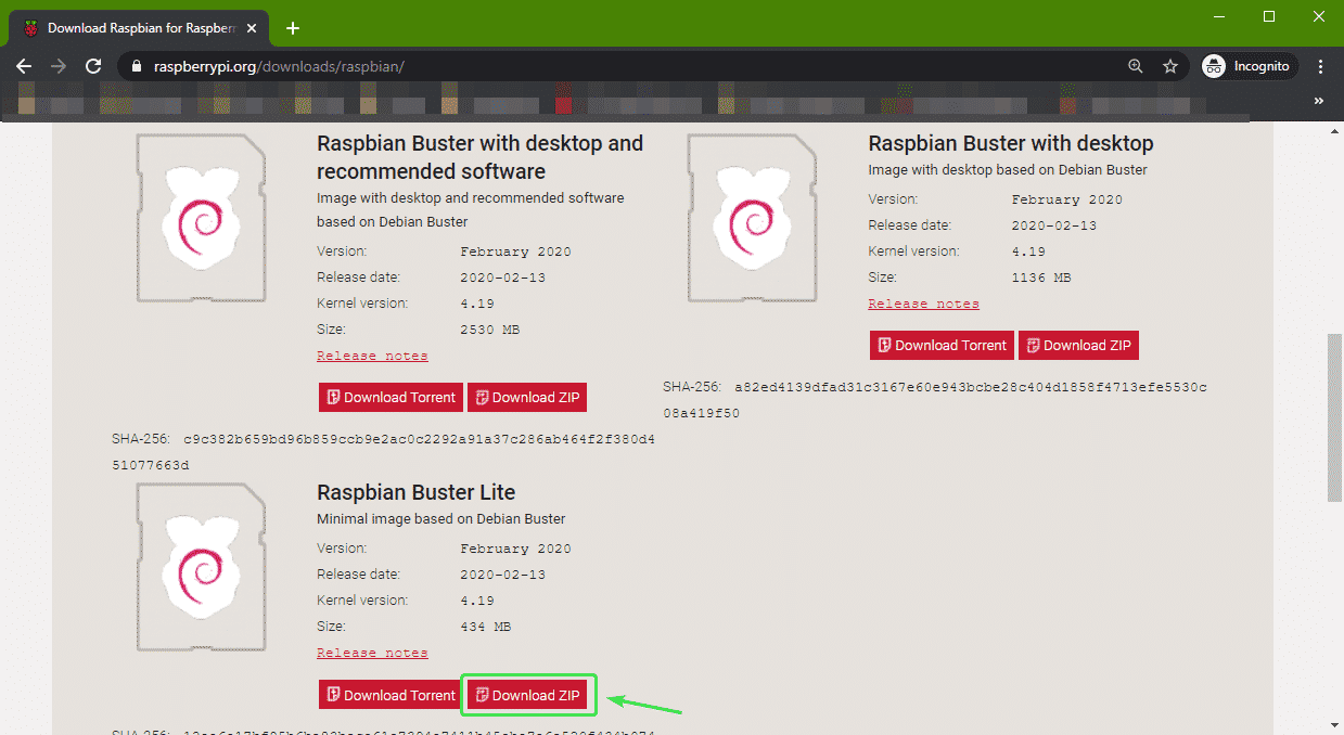 First, visit the official download page of Raspbian and click on the Download ZIP button of Raspbian Buster Lite image.
