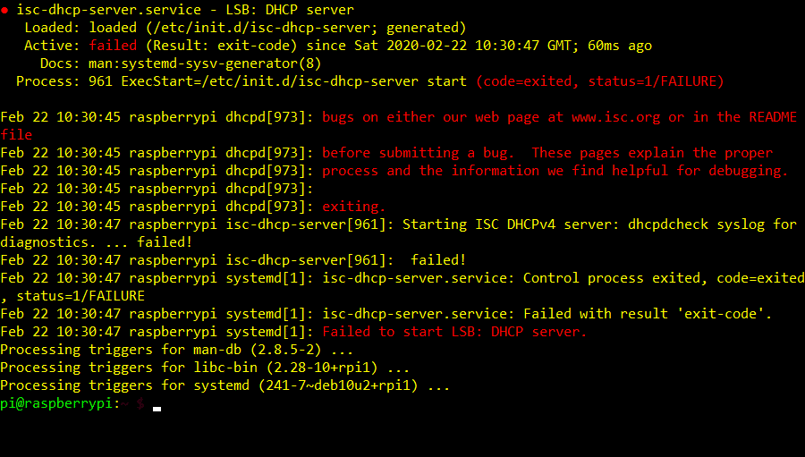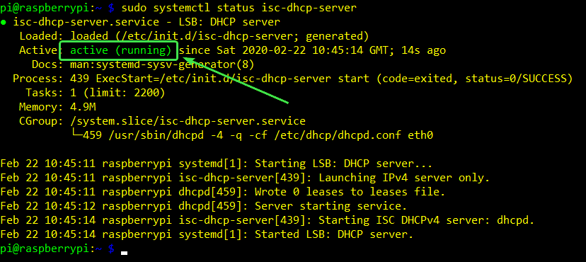 Once your Raspberry Pi starts, the isc-dhcp-server service should be active (running).