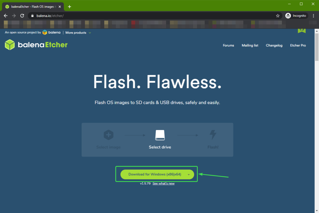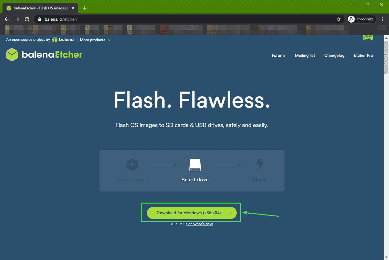 You can download Etcher, visit the official website of balena Etcher. Then, download and install Etcher.