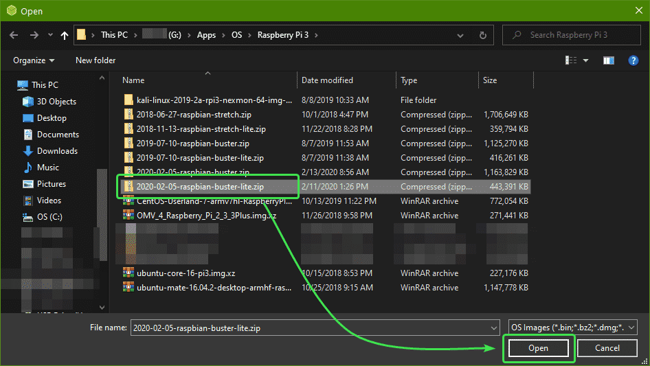 Select your Raspbian Buster Lite image that you’ve just downloaded and click on Open.