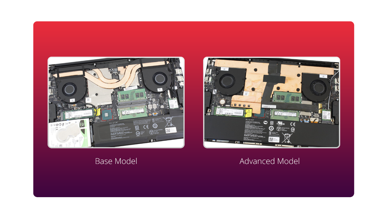 Modern games are GPU intensive and need powerful cooling systems. Razer designed some amazing cooling system to run games more than 60fps with no overheating and quieter fans. Running AAA games on a thin designed with less fan noise is phenomenal. The cooling system of the advanced is different altogether, it is installed with a vapor chamber. Base models also come with special heat pipes to dissipate heat.