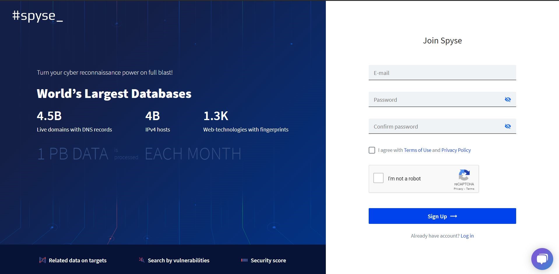 Spyse has a web-browser interface. It doesn’t have any installable package. I will show you how to access the Spyse toolset. On your browser window, open a new tab and type spyse.com. Next, click the signup button.