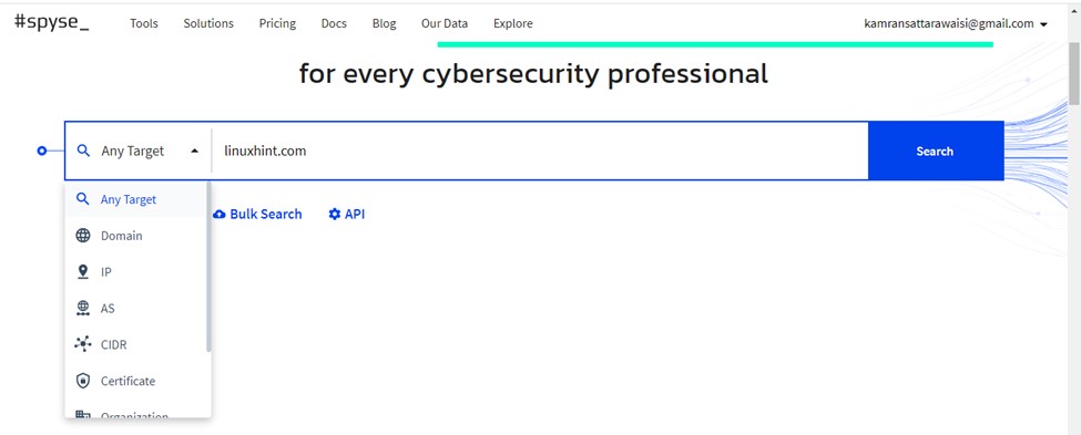 To recon a domain with Spyse, on the dashboard screen, select the ‘Domain’ option from the given list and enter the domain in the search box.