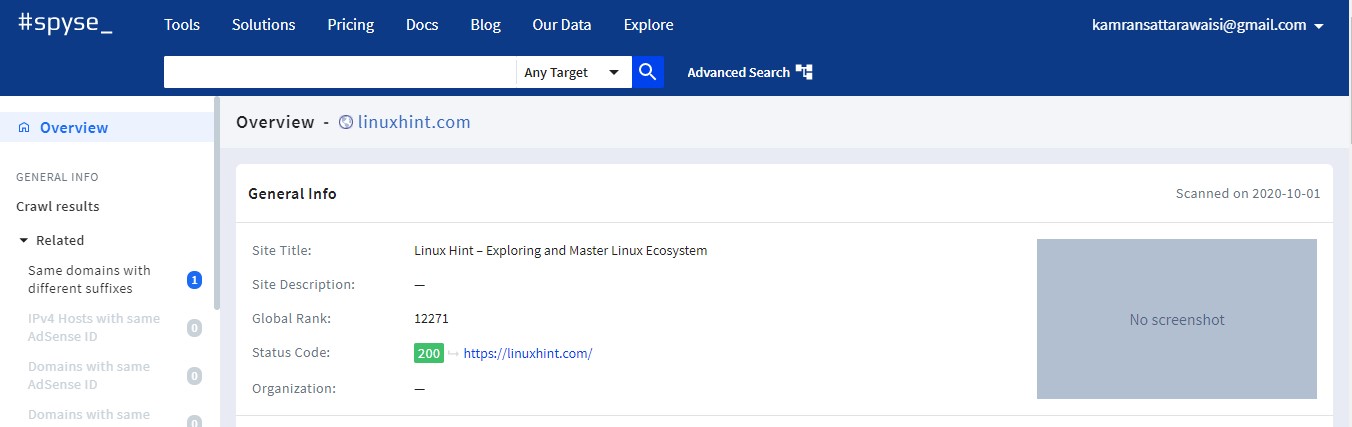 Next, click on the ‘Search’ and Spyse will display all the related domain information. First, a General information section will be displayed. Additionally, Spyse displays the DNS record, DNS History, Technologies information, etc.