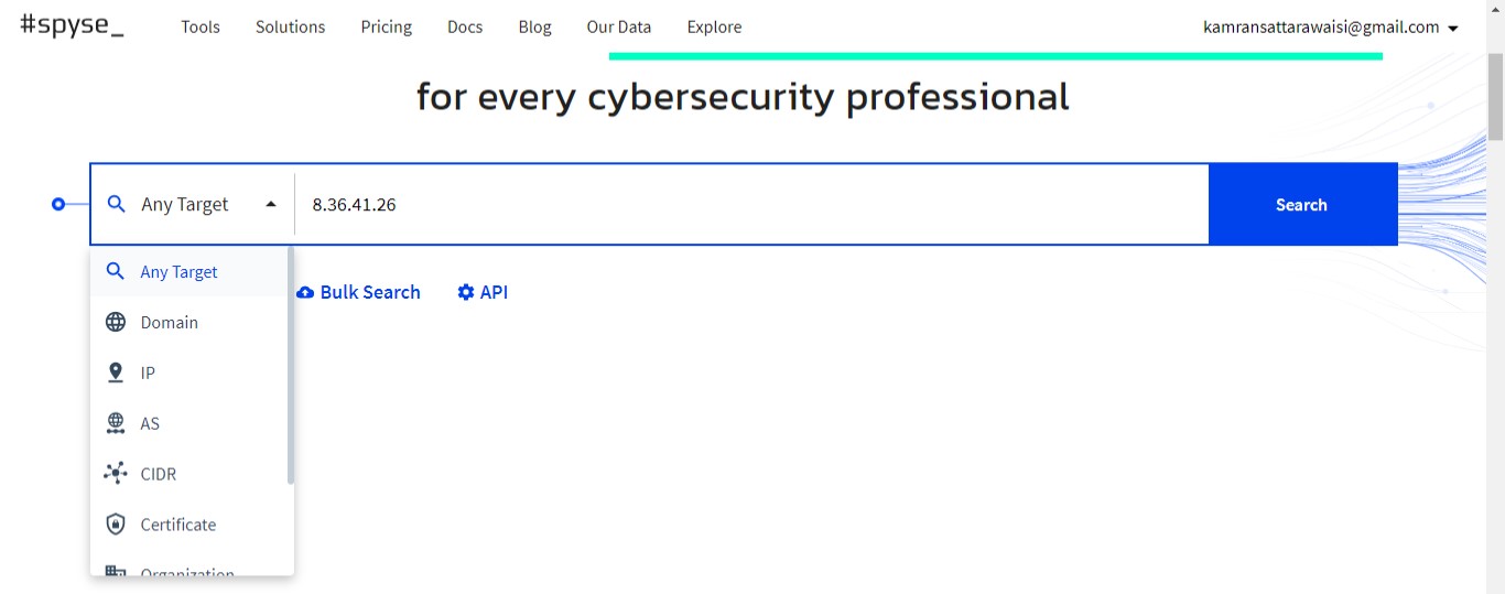 Similarly to recon IP with Spyse, select the ‘IP’ option from the given list and enter the domain in the search box on the dashboard screen.