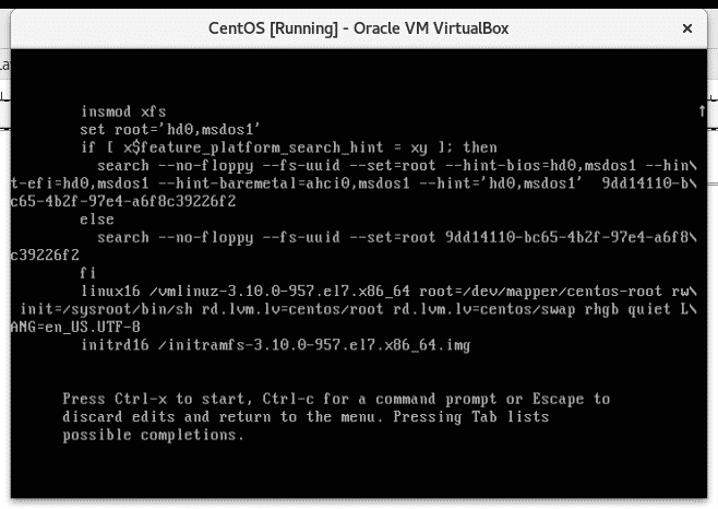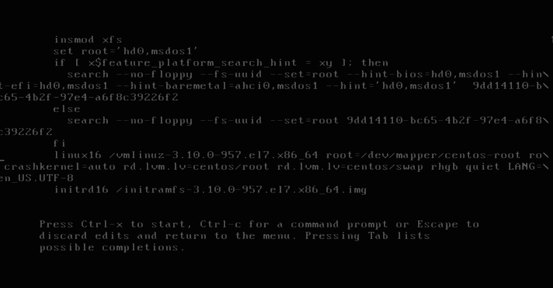 To reset your CentOS root password you’ll need to reboot or turn off your computer. Then turn on your computer and when GRUB starts press e to edit the rules and then press enter.