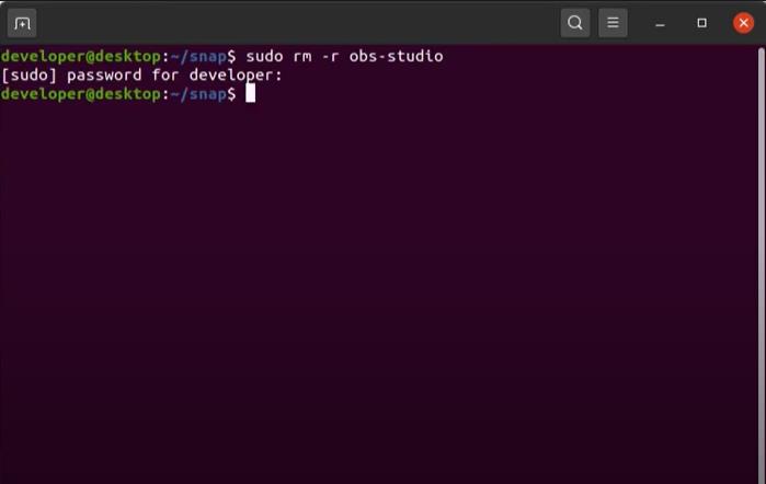 After completion of this procedure, you will see that OBS studio gets uninstalled from the system. However, the folder of OBS is still present in the snap folder, so execute the following command to remove it:
