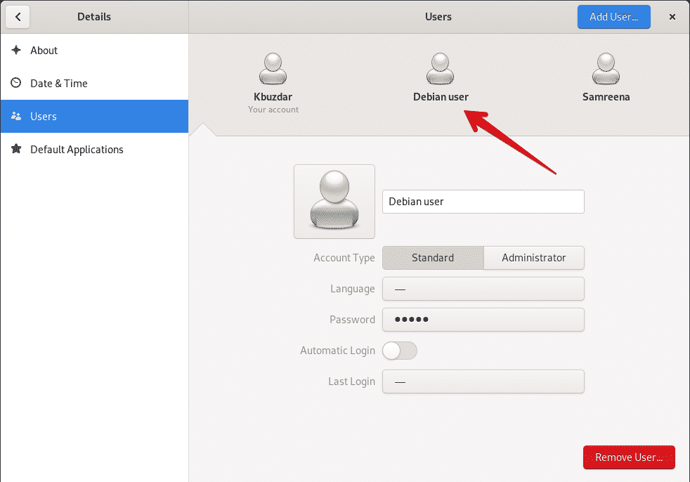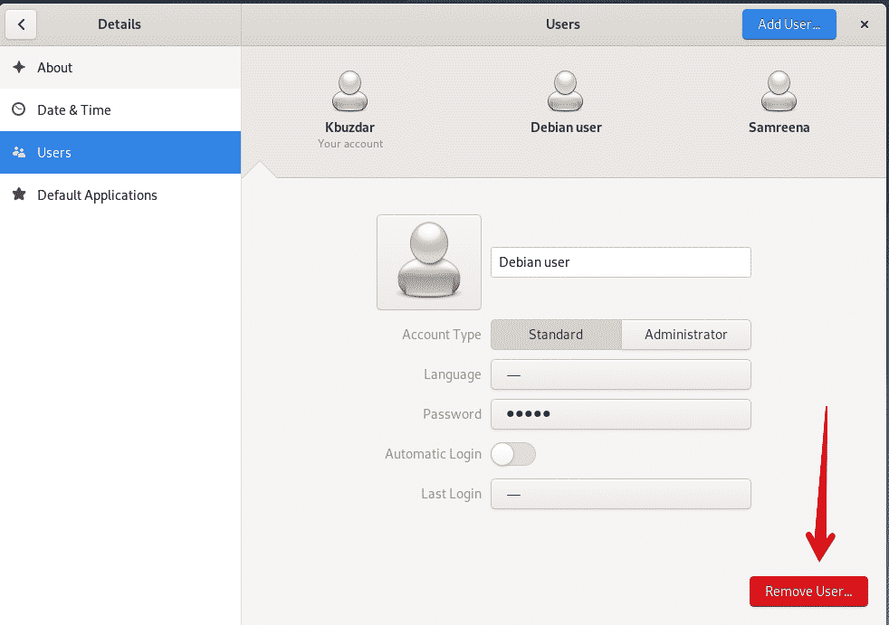 The following window will display on the screen. You can now remove the user from the system. Click on the user you would like to remove from the system. Here, the username ‘Debian user’ will be removed. ‘