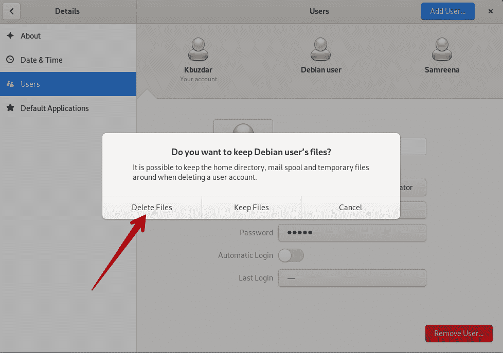 When you click ‘Remove User,’ the following dialog will appear on the screen, asking you whether you want to remove all associated files with this user or keep them in your system. To delete the user and the associated files, click ‘Delete Files.’ Now, the user has been successfully removed from your system.