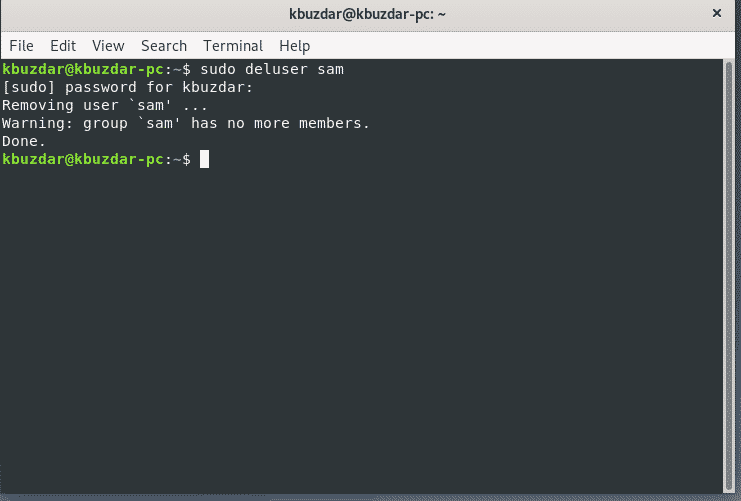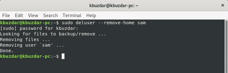 To delete a user along with the user’s directory, execute the ‘deluser’ command with the ‘-remove-home’ term.