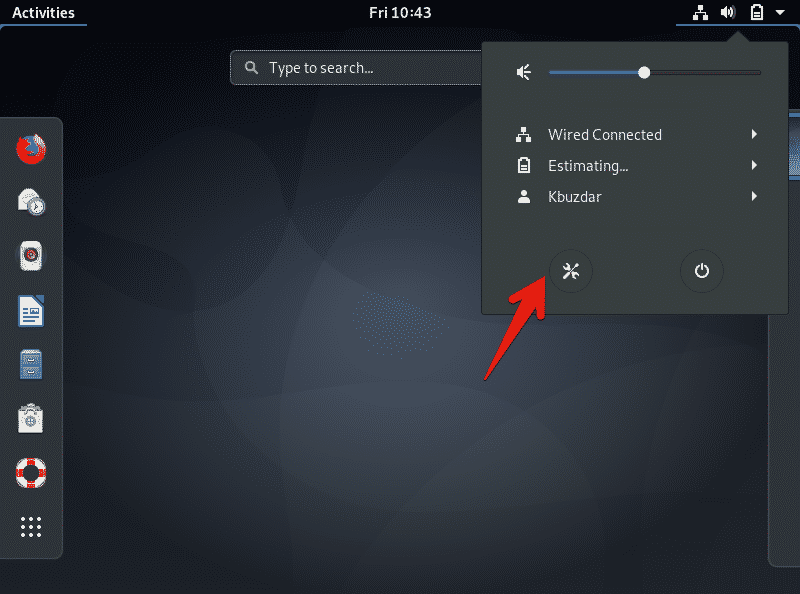 In this method, you can remove users from the system using the Gnome graphical desktop. To delete a user using the GUI, click the arrow sign from the top right corner of the desktop in Debian 10 Buster, and you will see the dropdown menu on the corner of the desktop. Click on the ‘Settings’ icon from the available dropdown menu items.