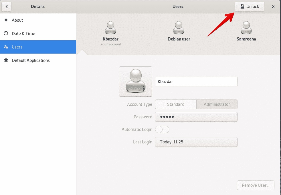 The following window will be displayed on the system. To remove a user, you will need to unlock the current user for verification. Click on the top right corner button, ‘Unlock.’
