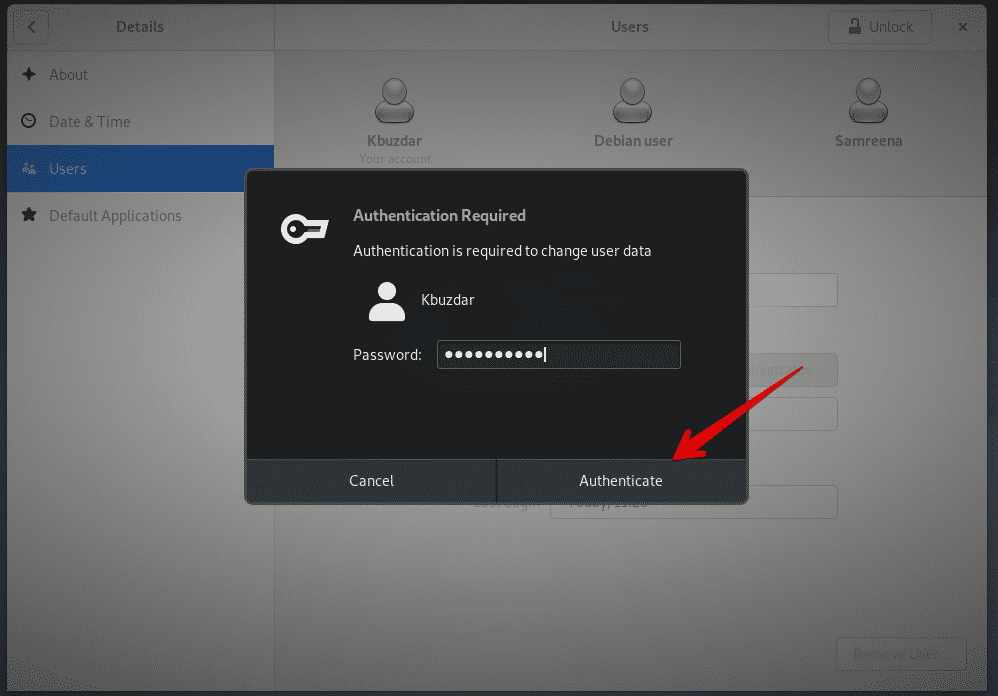You will see the following dialog prompt display on the screen. Here, you will enter the current administrator user password for authentication. Enter the password and click the ‘Authenticate’ button.