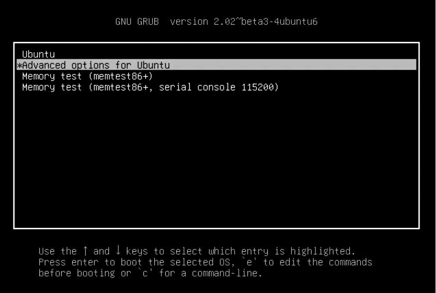 Turn on your computer system and go to the grub menu. Mostly it appears immediately, but if that doesn’t happen, press escape or hold the shift key down until it appears. While working on VM-ware or VirtualBox, when the Oracle or VM-ware logo appears, you have to press the shift key. GRUB menu will be prompted to your screen, here select “Advance Options for Ubuntu“.