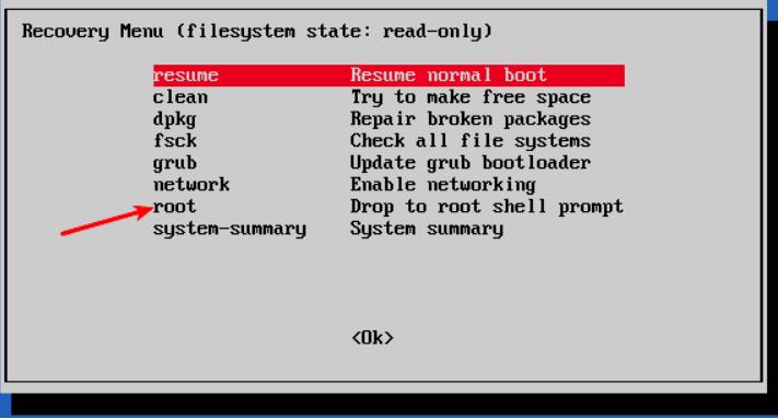 You will be provided with numerous recovery mode options here. Select the one named “Root – Drop to Root Shell Prompt” from the given options. Press enter, and you’re all set.