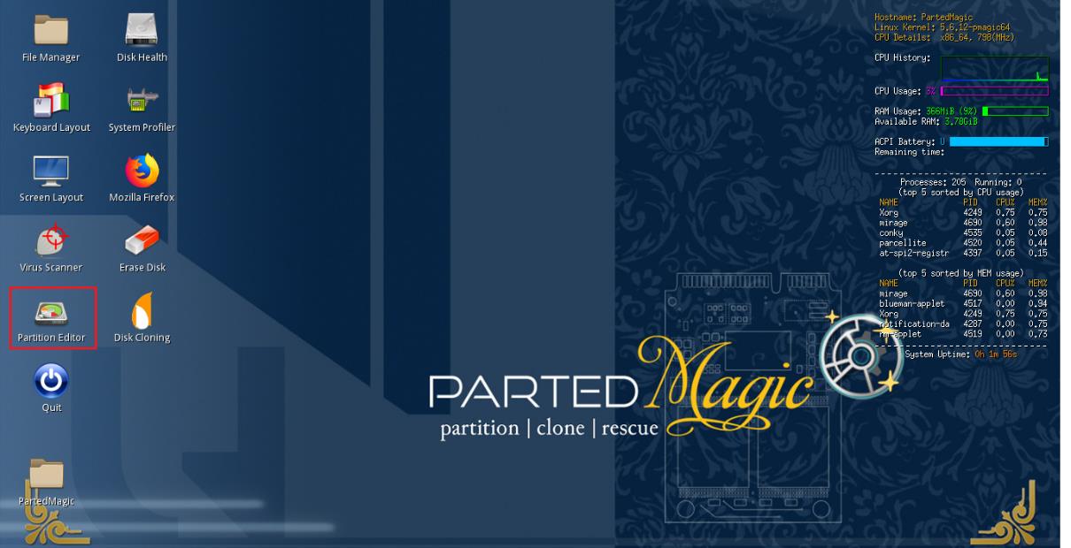 1. Start by booting up PartedMagic. Once you’re on the desktop, launch GParted by selecting Partition Editor on the desktop.