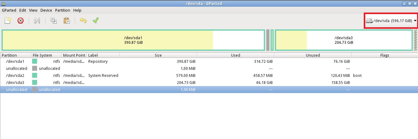 2. This will automatically launch GParted and list all the available disks. Select the target disk from the main menu. By default, GParted selects the first disk from the list of the connected devices. Choose the desired disk from the dropdown menu.