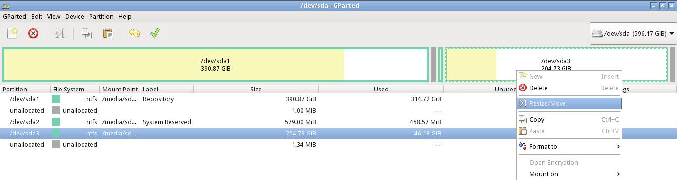 4. Now, select the partition you wish to resize and right-click. Select Resize/Move option. If you have multiple partitions, select the partition at the end, making it easy to reattach the partition if desired.
