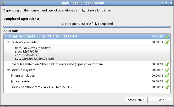 9. GParted will apply all the pending operations. It will display the progress as it occurs and shows the Applying Pending Operations complete dialog window.