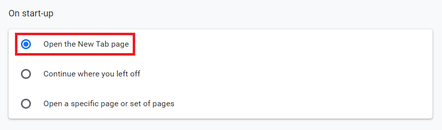 In the Google Chrome Settings window, scroll down to the “On start-up” section and then select the Open the New Tab page radio button as highlighted in the image shown below for restricting Google Chrome from restoring tabs.