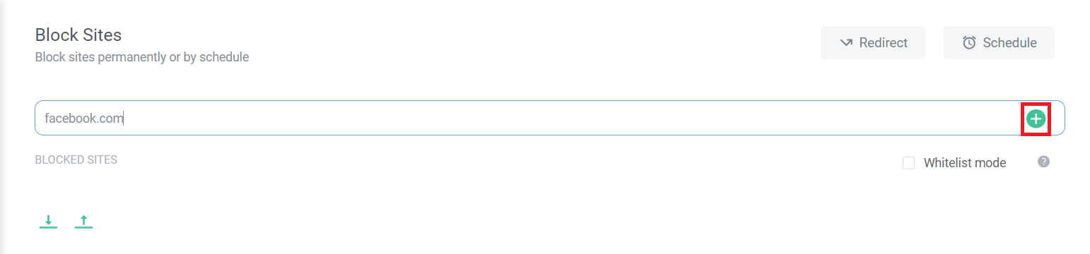 However, for the course of this discussion, we are not interested in the Whitelist Mode rather we would like to work with the default Blacklist Mode. For restricting a website on Google Chrome, you simply need to add those particular websites to the Block Sites text field. In this example, we wanted to restrict Facebook.com on Google Chrome. Therefore, we have typed Facebook.com in the respective text field and then clicked on the “+” icon to add this website to the blacklist of Block Site as highlighted in the image shown below: