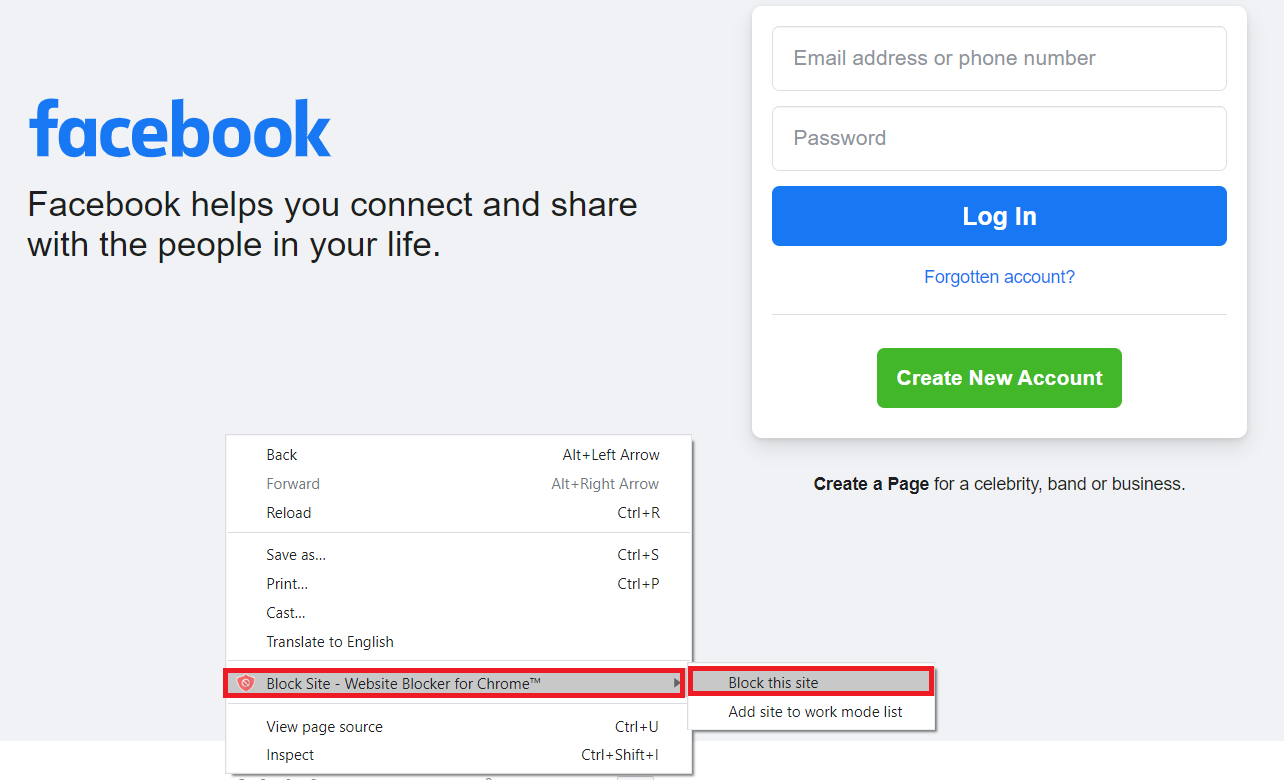By doing this, you will no longer be able to access Facebook via Google Chrome unless you remove it from the blacklist. Another method of doing the same thing is by visiting Facebook.com via Google Chrome after enabling the Block Site extension. Now right-click anywhere on the Facebook welcome page to launch a cascading menu. Select Block Site- Website Blocker for Chrome from the cascading menu and then choose Block this Site from the sub-cascading menu for restricting Facebook.com on Google Chrome as highlighted in the following image: