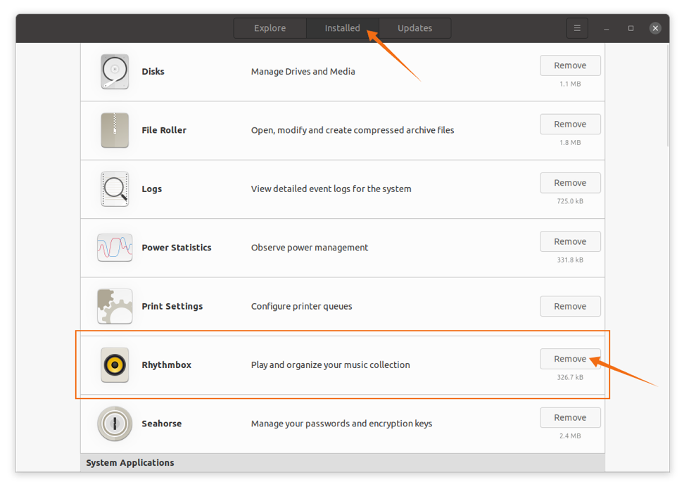 If the music player is installed using the software center, then to delete it, open the software center again and click on the “Installed” tab. Find Rhythmbox and click remove. The entire process is demonstrated in the image below: