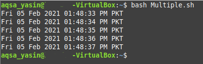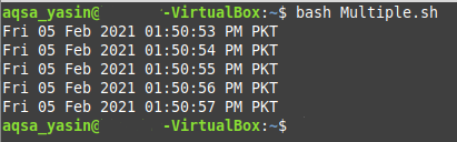 The result of the above Bash script is shown in the following image. The output contains the current system date and time at “5” different intervals, which means that our “date” command has been successfully executed for the specified number of iterations.