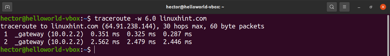 By default, traceroute waits for 5 seconds to receive a response. In certain situations, you may want to change the waiting time to be greater or less than 5 seconds. To do so, use the “-w” flag. Note that the time value is a floating-point number.