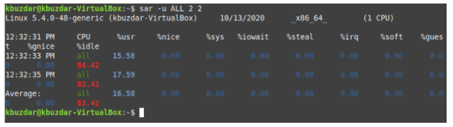 Running this command will show you the CPU statistics according to the values of TimeInterval and NoOfTimes, and average values are also provided. Moreover, it will save this output to a file.