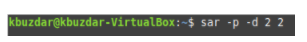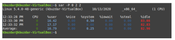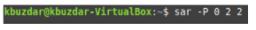 We can check the CPU-related statistics of a specific CPU core with the SAR command by running the following command in our terminal: sar –P CPU_Core TimeInterval NoOfTimes. The SAR command can be used with the -P flag by providing the CPU core (an integer value ranging from 0 to TotalNoOfCores-1) to check the CPU-related statistics of a specific core. Here, TimeInterval specifies the time in seconds after which you want to check your CPU statistics, and NoOfTimes specifies how many times you want to check the CPU statistics of the specified core.