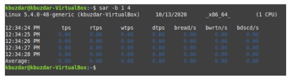 To check I/O-related statistics with the SAR command, we must first run the following command in our terminal: sar –b TimeInterval NoOfTimes. The SAR command can be used with the -b flag to check all the I/O-related statistics. Here, TimeInterval specifies the time in seconds after which you want to check your I/O statistics, and NoOfTimes specifies how many times you want to check the I/O statistics. For this example, we want to check the I/O statistics every second until we have checked the statistics four times.
