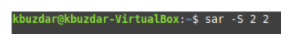 The swap memory is defined as the memory that can be borrowed from the hard disk when your RAM runs out of space. To check the swap memory-related statistics with the SAR command, we must first run the following command in our terminal: sar –S TimeInterval NoOfTimes. The SAR command can be used with the -S flag to check the swap memory-related statistics. Here, TimeInterval specifies the time in seconds after which you want to check your swap memory statistics, and NoOfTimes specifies how many times you want to check the swap memory statistics. For this example, we want to check the swap memory statistics every two seconds until we have checked the statistics twice.