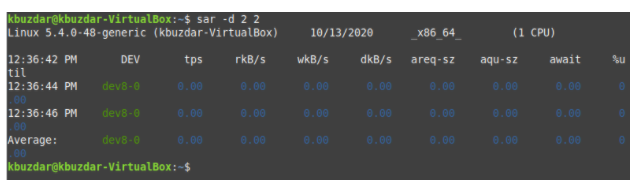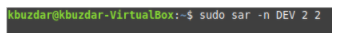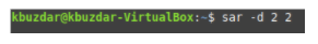 The I/O statistics contain the information related to the input and output devices. However, if you want to check only the disk-related statistics with the SAR command, then you must first run the following command in the terminal: sar –d TimeInterval NoOfTimes. The SAR command can be used with the -d flag to check all the disk-related statistics. Here, TimeInterval specifies the time in seconds after which you want to check your disk statistics, and NoOfTimes specifies how many times you want to check disk statistics. For this example, we want to check disk statistics every two seconds until we have checked the statistics twice.