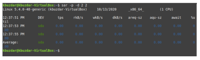 This task is variation of that described above. Here, we check all the disk names by runing the following command in our terminal: sar –p –d TimeInterval NoOfTimes. SAR can be used with the -p and -d flags to check all the disk names. Here, TimeInterval specifies the time in seconds after which you want to check your disk names, and NoOfTimes specifies how many times you want to check the disk names. For this example, we want to check the disk names every two seconds until we have checked the statistics twice.