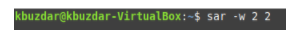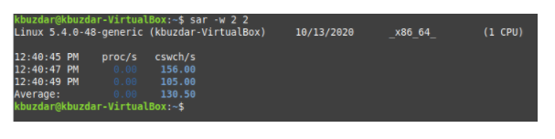 To check all the context switching statistics with the the SAR command, we must first run the following command in our terminal: sar –w TimeInterval NoOfTimes. The SAR command can be used with the -w flag to check all the context switching statistics. Here, TimeInterval specifies the time in seconds after which you want to check your context switching statistics, and NoOfTimes specifies how many times you want to check the context switching statistics. For this example, we want to check the context switching statistics every two seconds until we have checked the statistics twice.
