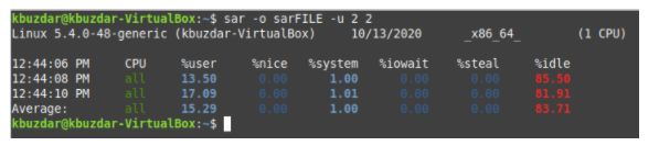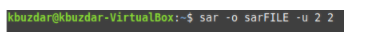 You can save the output of the SAR command for later use by running the following command in your terminal: sar –o FileName -u TimeInterval NoOfTimes. The SAR command can be used with the -o flag and any other flag (according to the statistics you want to generate) along with a file name to save the result of your SAR command to a file. Here, TimeInterval specifies the time in seconds after which you want to save your SAR command output, and NoOfTimes specifies how many times you want to save the SAR command output. For this example, we want to save the CPU statistics (as indicated by the -u flag) every two seconds in a file named sarFILE until we have saved the statistics twice.