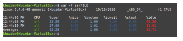 To use the SAR stats you saved to a file, you can run the following command in our terminal: sar –f FileName. Here, we want to retrieve the contents of sarFILE.