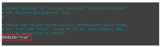 Once the sysstat file is open in the text editor, locate the line (ENABLED=”false”) and replace “false” with “true”, as shown in the image below, to enable the SAR command to collect your system activity data. After enabling this service, save your file and close it by pressing Ctrl+ X.