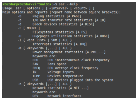 Run the following command in your terminal: sar –help. After executing this command, the syntax of the SAR command, all its variations and all the parameters that can be used with this command will be displayed.
