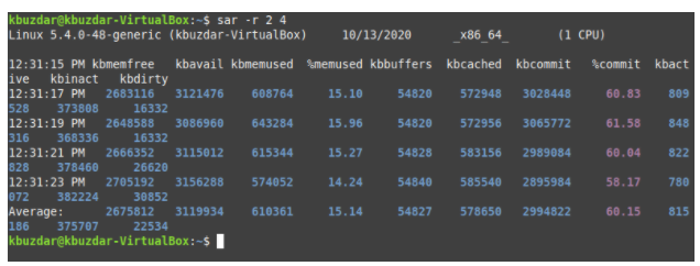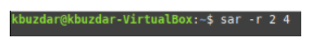 To check memory-related statistics with the SAR command, we must first run the following command in the terminal: sar –r TimeInterval NoOfTimes. The SAR command can be used with the -r flag to check memory-related statistics. Here, TimeInterval specifies the time in seconds after which you want to check your memory statistics, and NoOfTimes specifies how many times you want to check the memory statistics. For this example, we want to check the memory statistics every two seconds until we have checked the statistics four times.