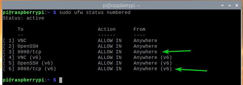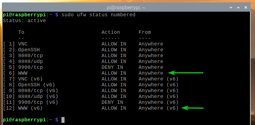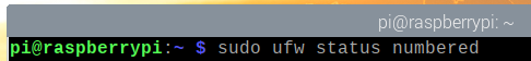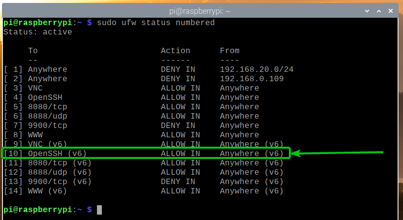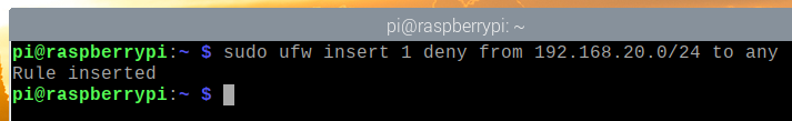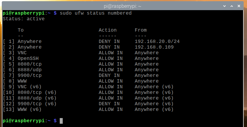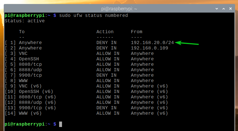 The UFW rule should be added in the correct position, as shown in the screenshot below. Now, no computer from the IP subnet 192.168.20.0/24 should be able to access your Raspberry Pi server.