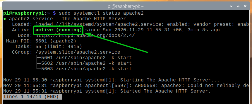 The apache2 systemd service should be running, as you can see in the screenshot below.